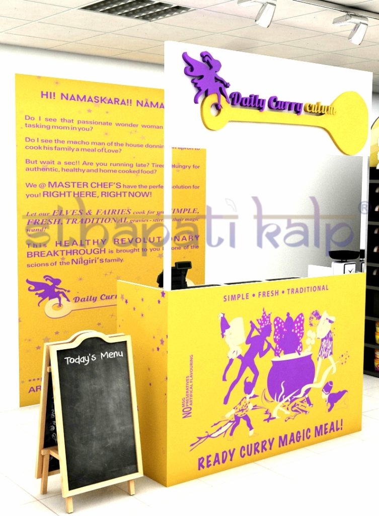 Cooking as an everyday activity for a working individual becomes an arduous task. As a relief Masterchef Food ventures Pvt Ltd, spearheaded by the daughter, Mahalakshmi, of the legendary ‘Nilgiris since 1905’ brand, built a concept to introduce ready to heat and eat meals, sometimes just with and addition of a protein. The idea was new in the market and required a bright, quirky and catchy concept to push it through. Designing from the logo to the branding image, text and the pop-up kiosk as a whole was our given task. A fairytale touch with elves and fairies doing the hard labour was the perfect magic solution thus