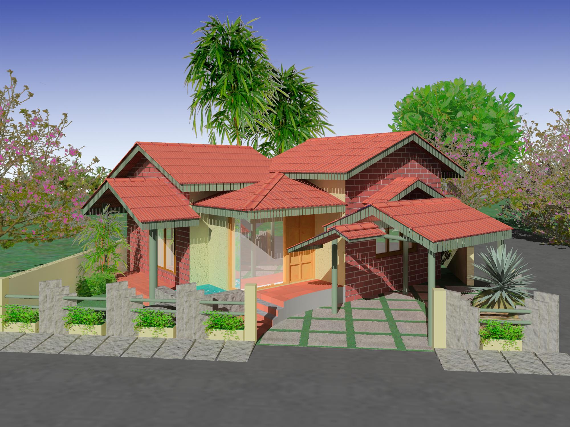 The house has an entrance porch and balcaos (balcony sit out spaces) with supporting columns, tiled roof, use of bright wooden trims and large windows influenced by the Indo-Portuguese fusion.