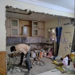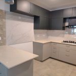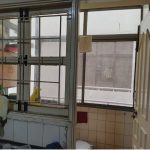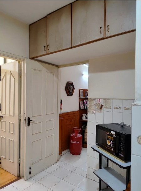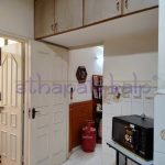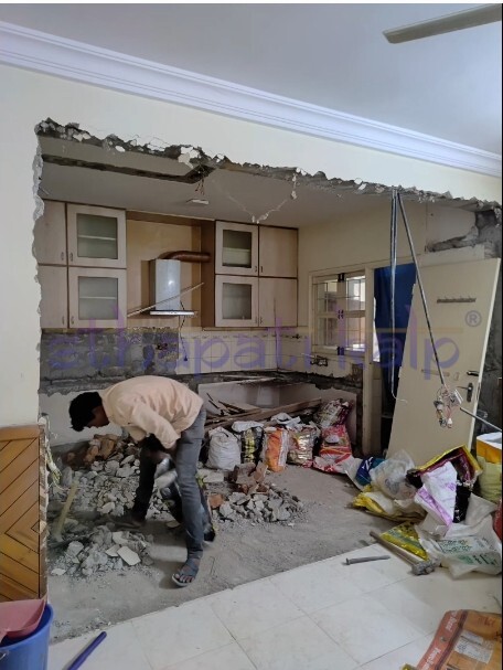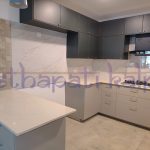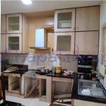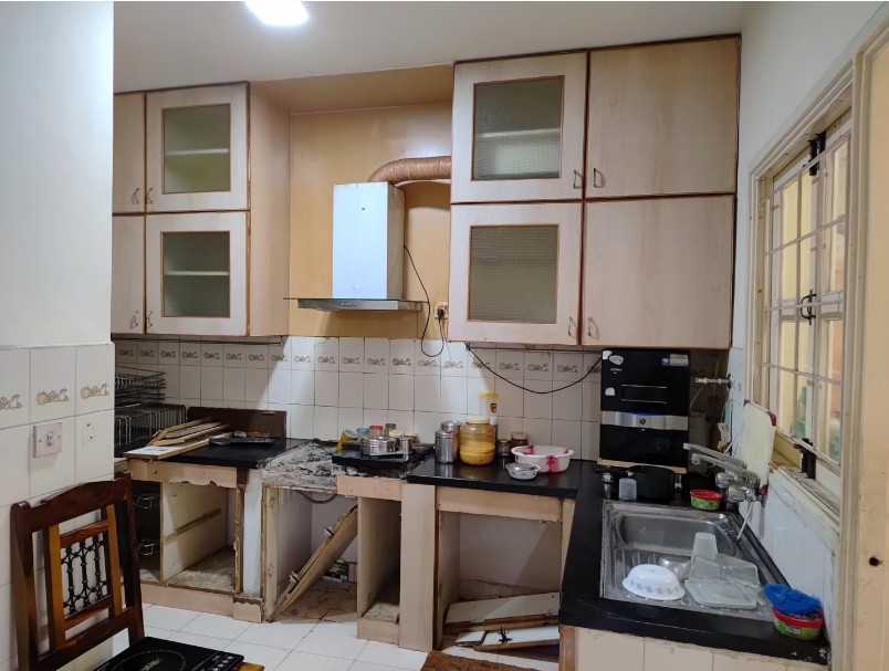 A congested kitchen in a 25 year old apartment complex building with very little usable space has been revamped by tearing down walls and opening it up into the dining and living areas. The old format is totally out and a new layout with a brand new look is the result achieved