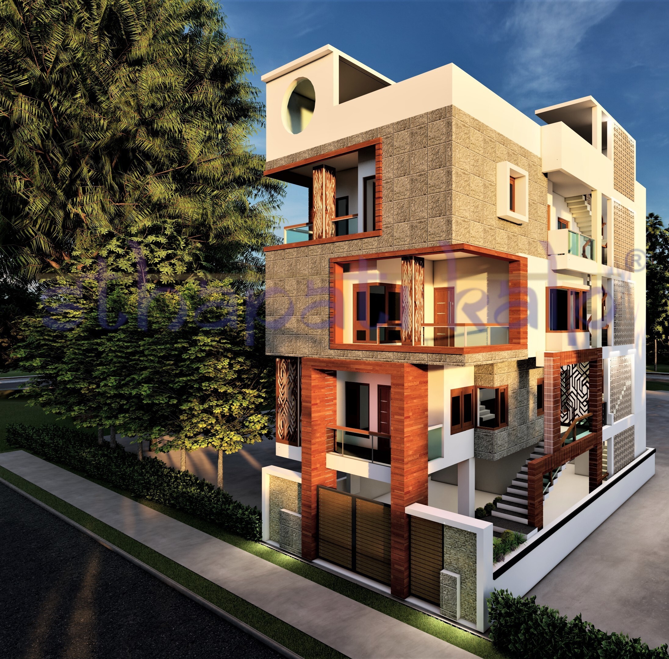 Different kinds of footings were designed to stabilize the structure. The trees were retained and the house was built around it. A stilt floor has been designed for parking and the house is a duplex with an additional floor for rental income